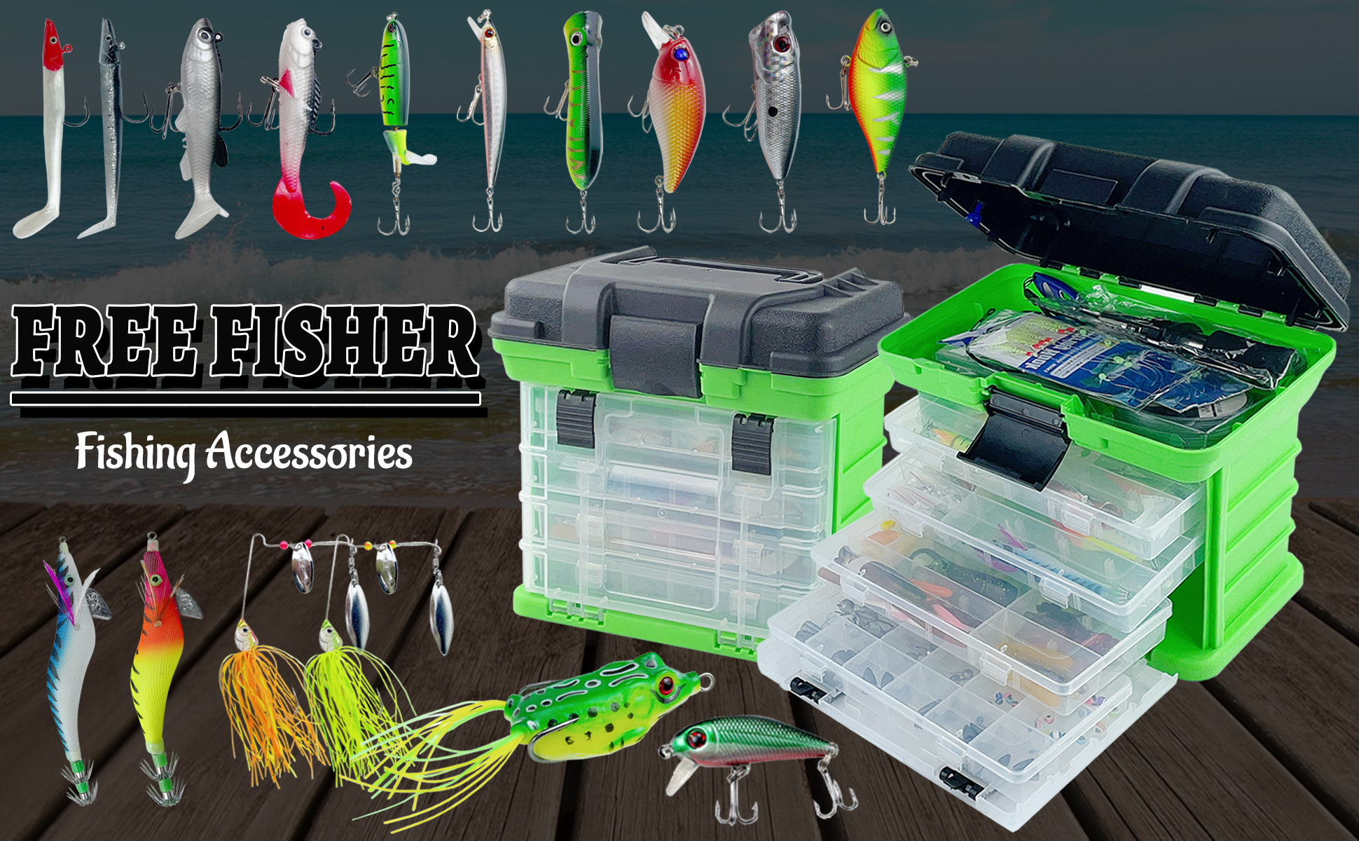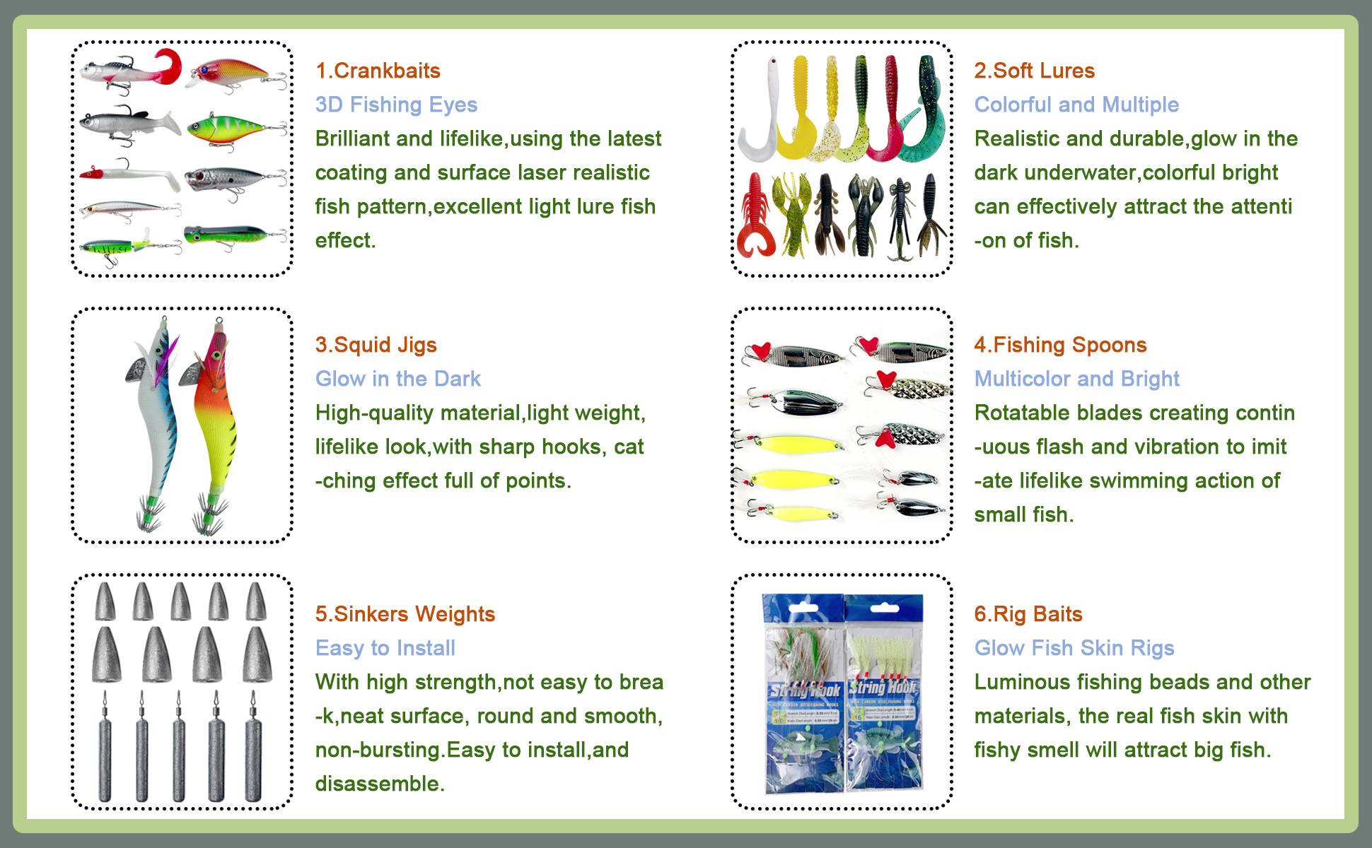1.Including:Fishing Minnows,Poppers,Crankbaits,VIB Lures,Soft Lures,Spinnerbaits,Spoons,Swivels,Hooks,Tools,Floats,Line,Lead Sinkers,Rod Bells,Beads and so on.