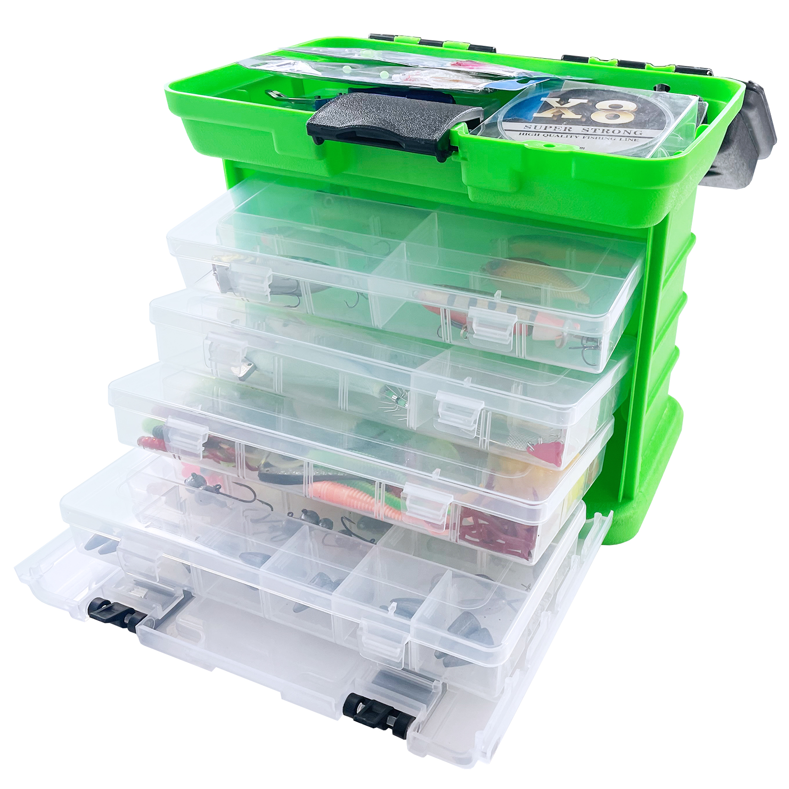 2.4-layer design: This fishing box features four layers of extractable objects, allowing you to sort and freely adjust the size of different items. Four small transparent compartments can accommodate various fishing accessories.