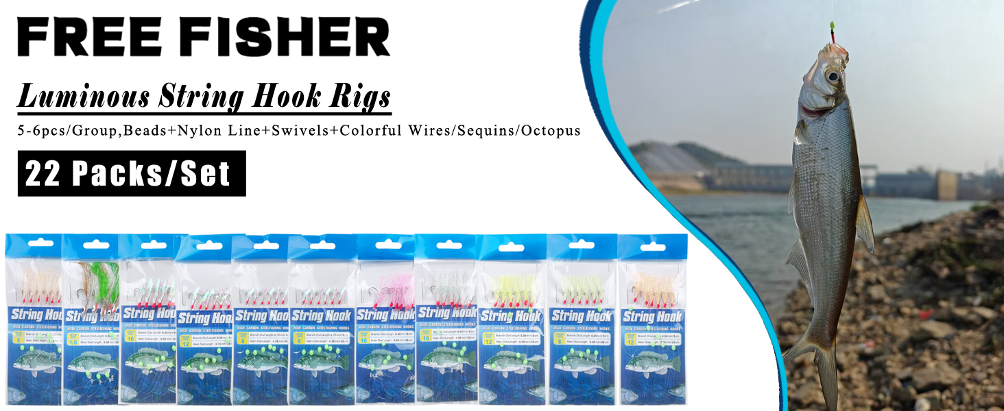 Fishing String Hooks Set 22 Pieces Nylon Line Fish Skin Rigs with Beads Swivel Feather Hooks Baits Luminous Shrimp Lures