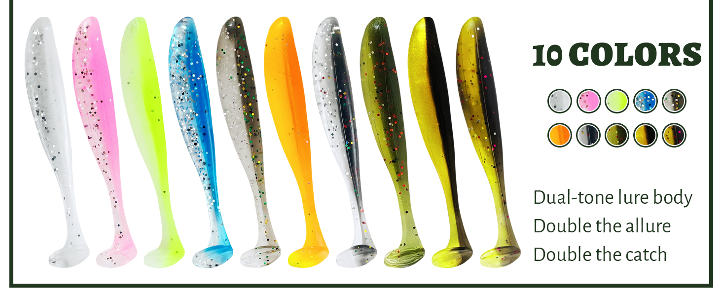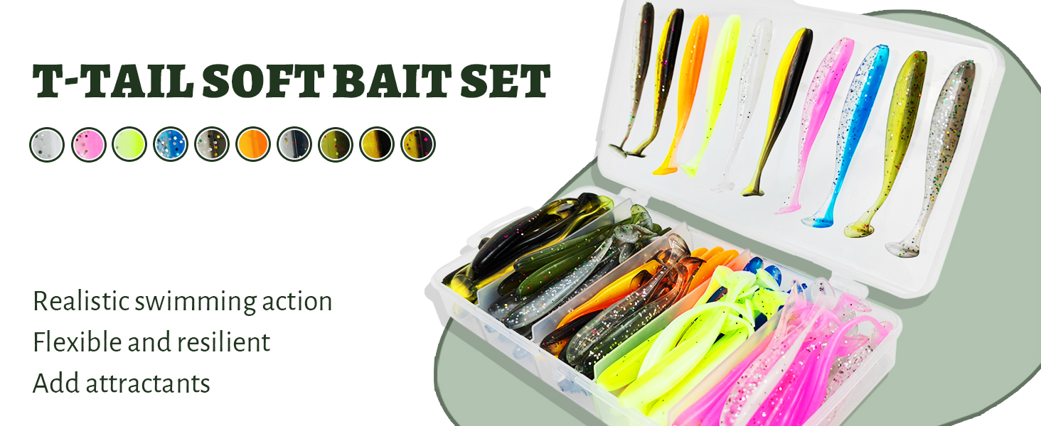 🎣5.Soft Baits Kit:Soft bait has a fishy smell,helps to draw fish in and make them hold on longer for more positive hook sets.The swimbait not only looks and moves like a live bait, but also tastes like one.The soft swimbaits features a flat high ction paddle tail, helps flap and vibrate with a hard thump, delivers a fish attracting action that bass have trouble resisting.