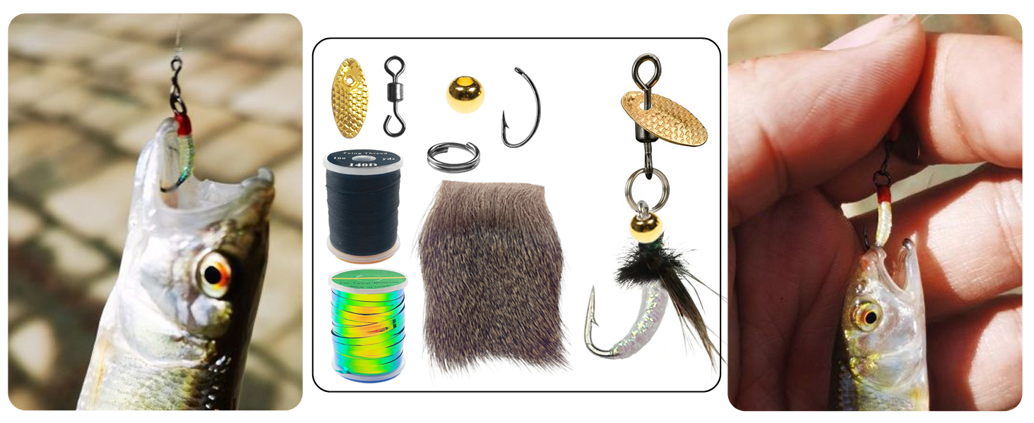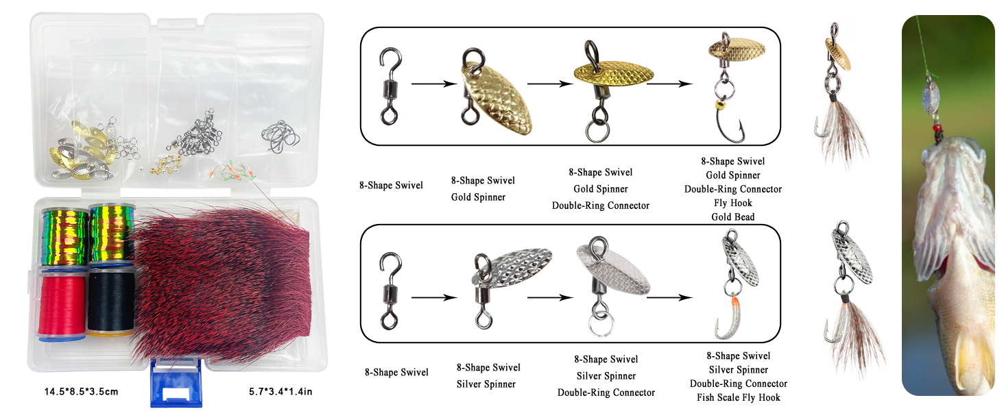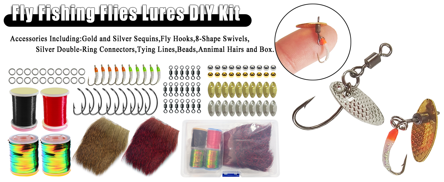 1.Fishing Flies Accessories Kit:Including Metal Sequins,Animals Hair,Fly Hooks,Tying Line,Bright Color Crystal Flash Holographic Tinsels Skirts,Beads and Swivels.More Kinds and Multi-Function Materials.