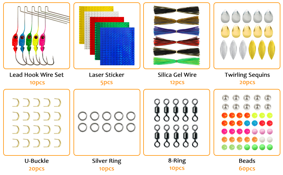 🎣1.148pcs Including:10*Lead Hook Wires+50*Beads+10*Double-ring+10*Silver Beads+20*U-Buckle+10*8-Shape Swivels+20*Metal Sequins+12*Rubber Skirts+5*Laser Sruckers+1*Box.