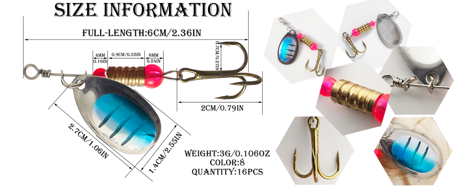 Style A Spinners:6cm 3g 8-color,16pcs(4pcs with Feather Hook)