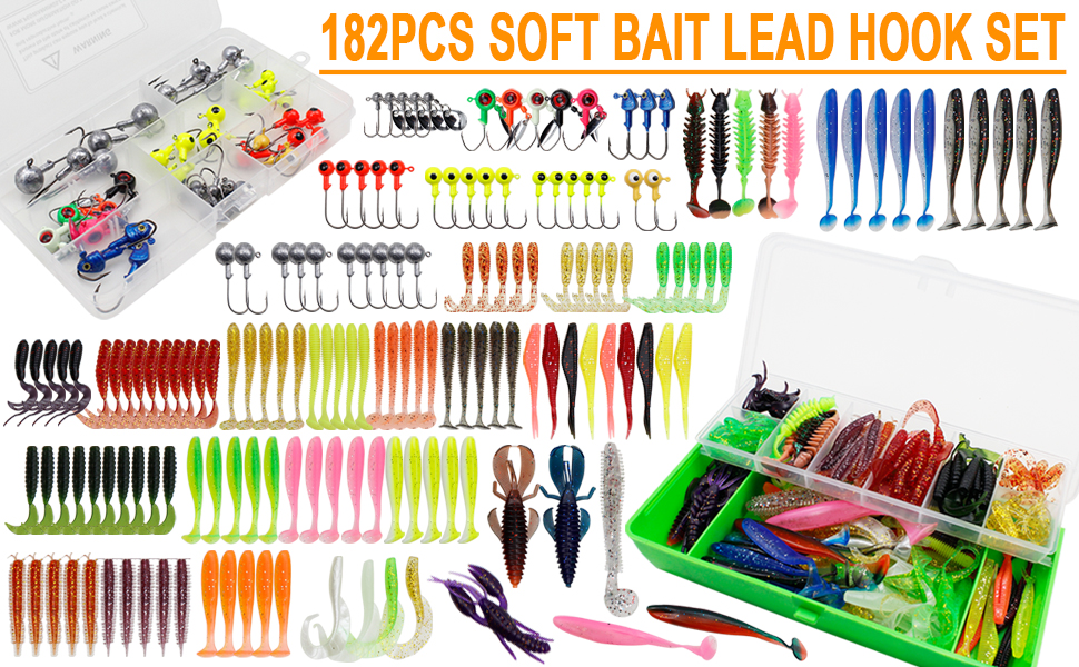 FREE FISHER 182pcs/Box Fishing Soft Swimbaits Set T-tail Worms Wobblers Fishing Jigs Aritificial Baits Jigging Hooks for Saltwater/Freshwater