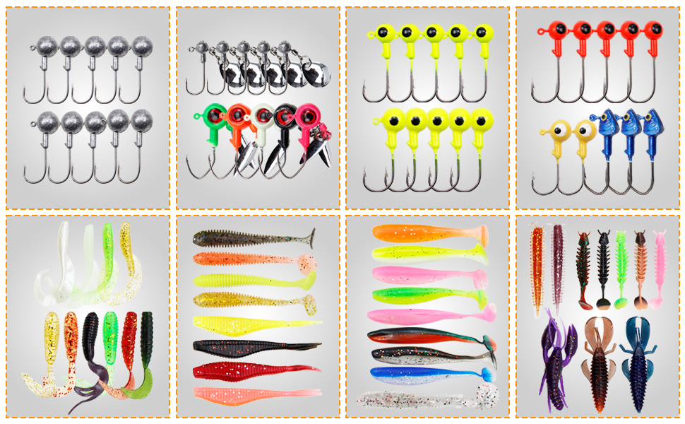 🍏Package List:140pcs Soft Lure with box+40pcs Lead Hooks with Box