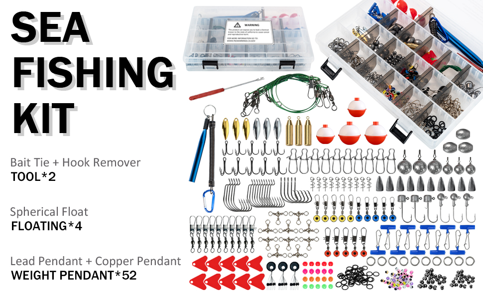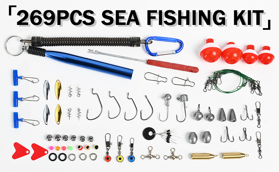 🎣1. List of Mixed Sea Fishing Kit Box 269pcs : 1*Hook tying device, 1*Unhooker, 5*Steel Leader Line, 4 *Ball Floats, 10*Red Heart Noise Sheets, 3*Space Beads, 6*Spoon Blades, 20*Fish Eye Beads, 20*4-Color Beads, 50* Various Connection Swivels, 20*Black Rubber Rings, 5*Lead Head Hooks, 10*Treble hooks, 32*Crank Hooks, 52*Various Lead Sinkers, 15*Space Bean Swivels,4*Lead Hook Baits,1*Box.