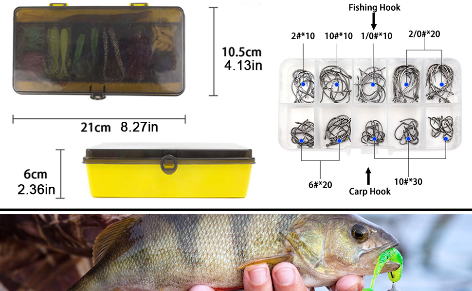🎣3.Fishing Weights & Hooks:Split-Shot Sinkers,Different Bullet-Shape Weights,Water-Droplet.More kinds of hooks,likes crankhook,jig head hooks,bent hooks and 100pcs hooks in box.High carbon steel,sharp hook tip,more usefull.