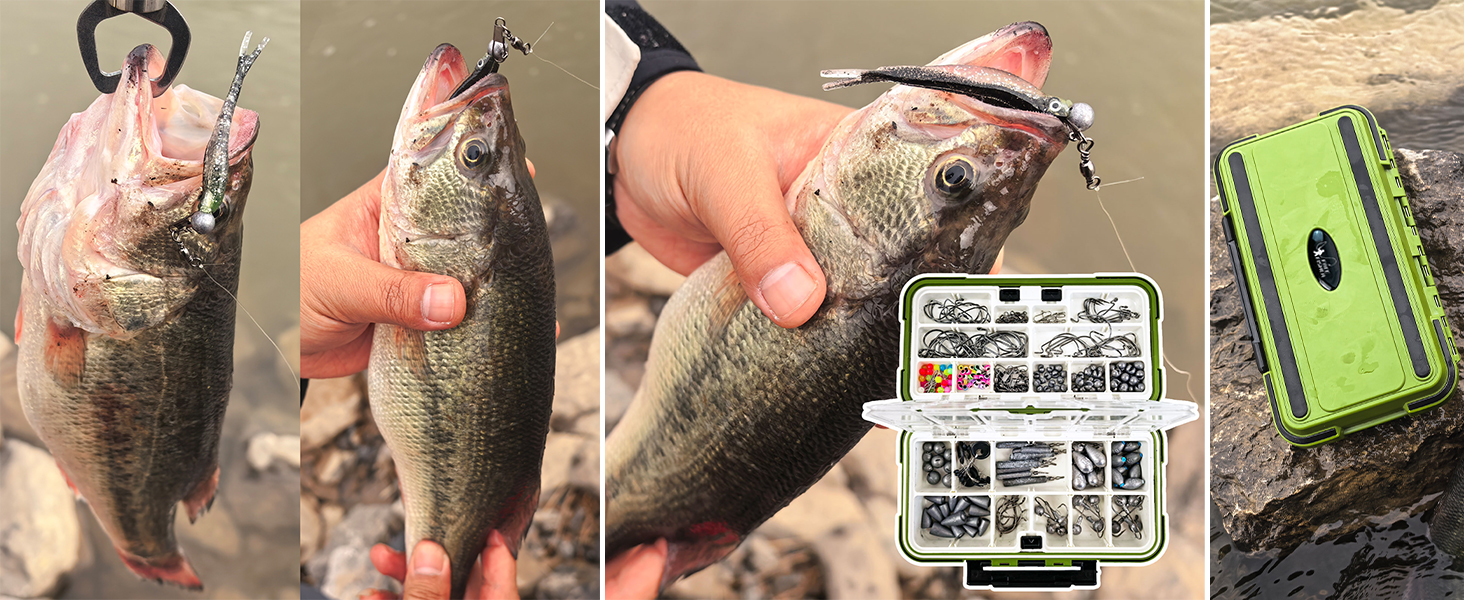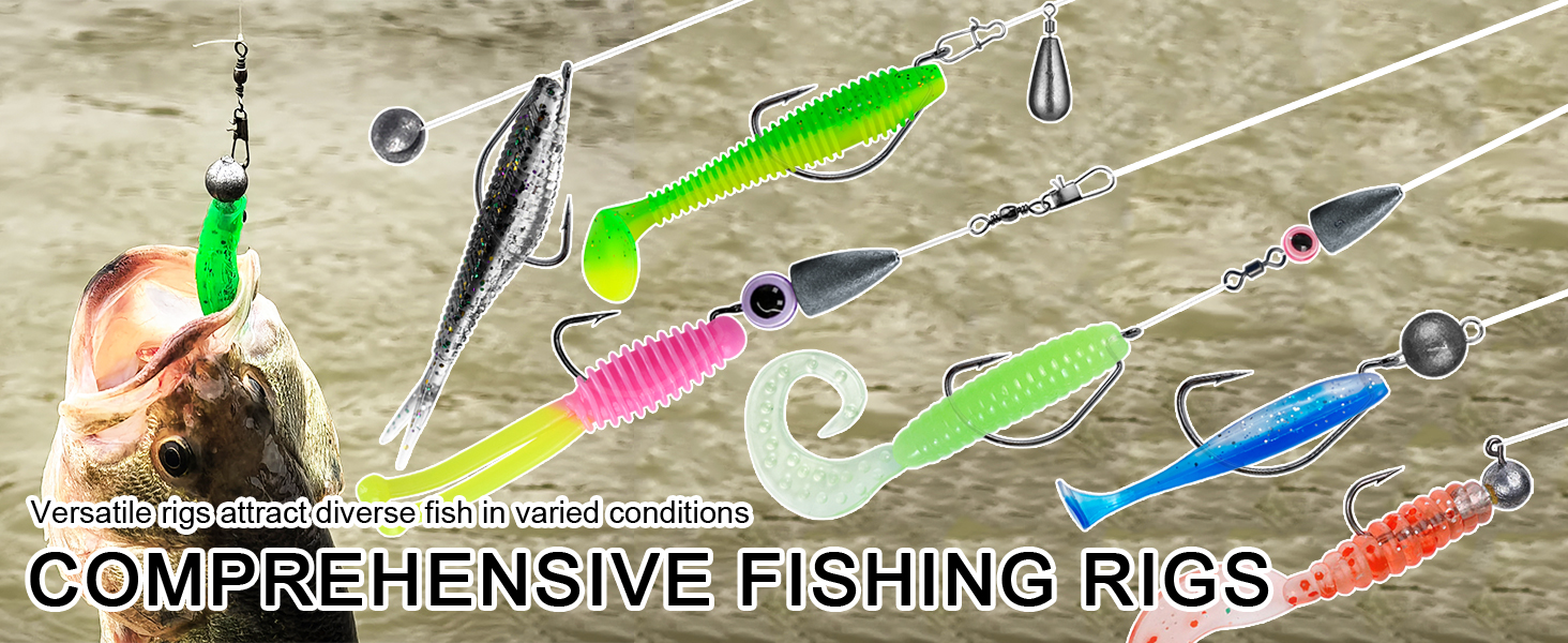 4Abundant accessories in the tackle box with tackle included can provide a variety of fishing rigs you want! Such as Split Shot Rig, Wacky Rig, Jig Head Rig, Texas Rig, Carolina rig, Drop Shot Rig, Float Rig, Three Way Rig, and Knocker Rig.