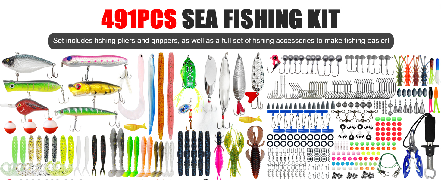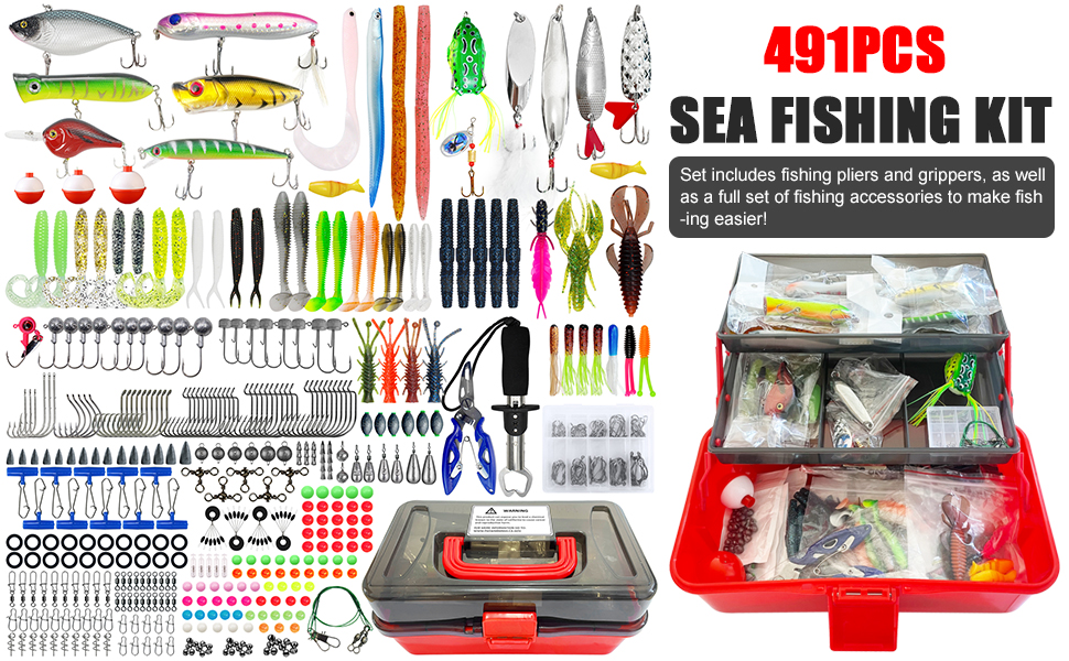 FREE FISHER 491pcs/Box Fishing Tackle Kit Mixed Soft Lures Hard Baits Fishing Griper Hooks Sinkers Jigs Swivels Beads for Freshwater Saltwater