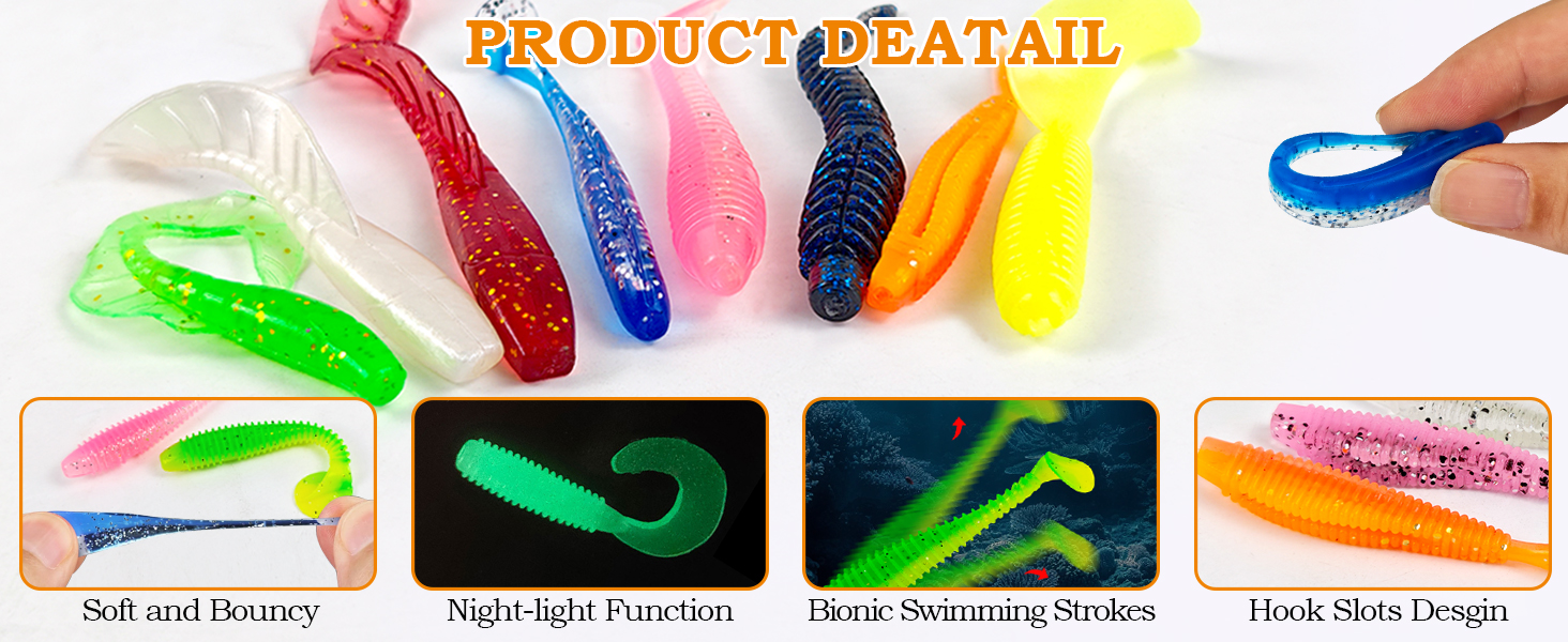 🎣1.Double-Color T-Tail Worms(24pcs):smooth surface and threaded, with a dual color design and sequins. The reflected light after entering the water achieves a good fish attracting effect. T tail swings to update the tail, attracting fish attacks.
