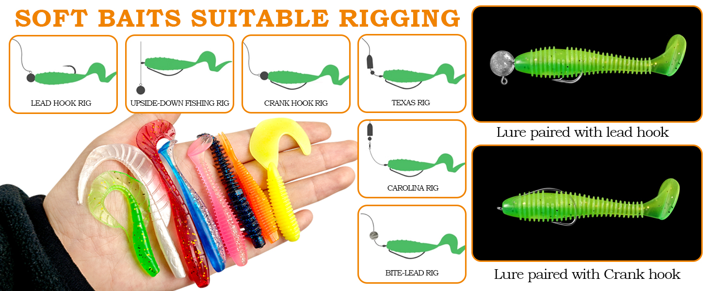🎣4.Threaded Needle-Tail(10pcs):The flexible needle tail design, high swing frequency, full body thread design, enhances water turbulence and bubbles during swimming, and the enlarged head design is very suitable for use with the Ned hook.