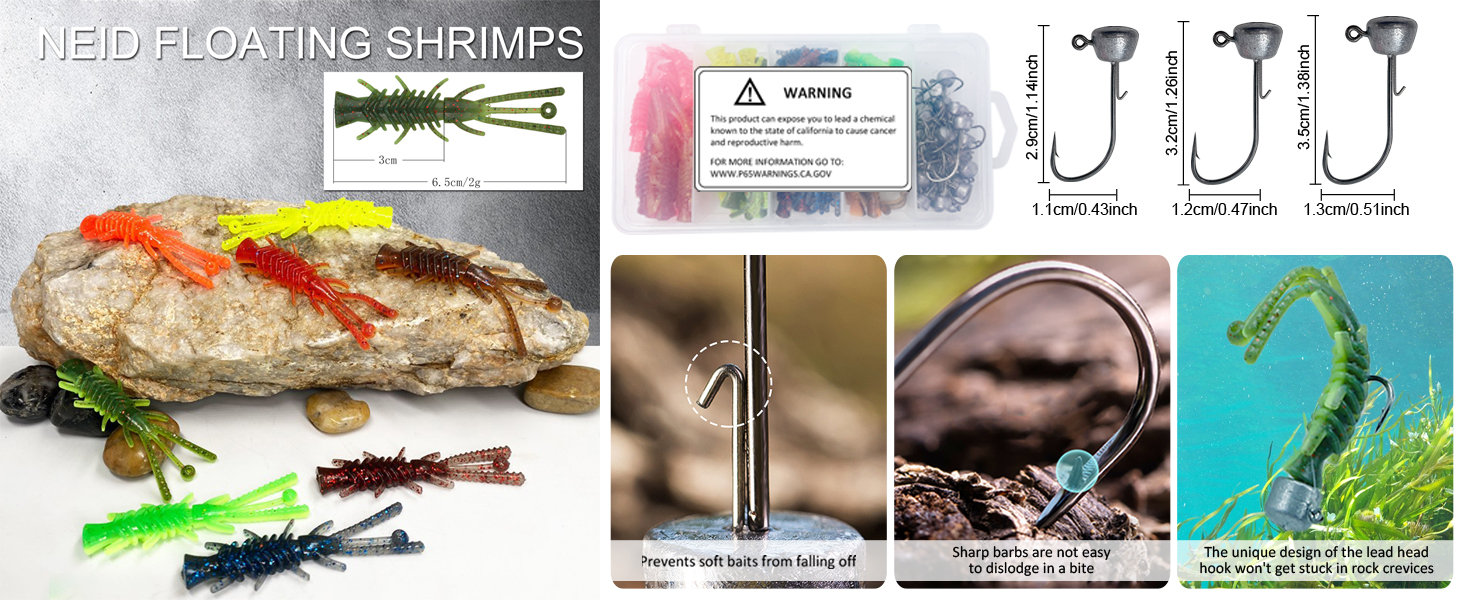 🎣1.NEID FLOATING SHRIMP:High buoyancy and low specific gravity, with a strong fishy taste and added salt, it is soft, tear resistant, and bite resistant. After entering the water, the swimming posture is turbulent, making it easy to attract fish attacks