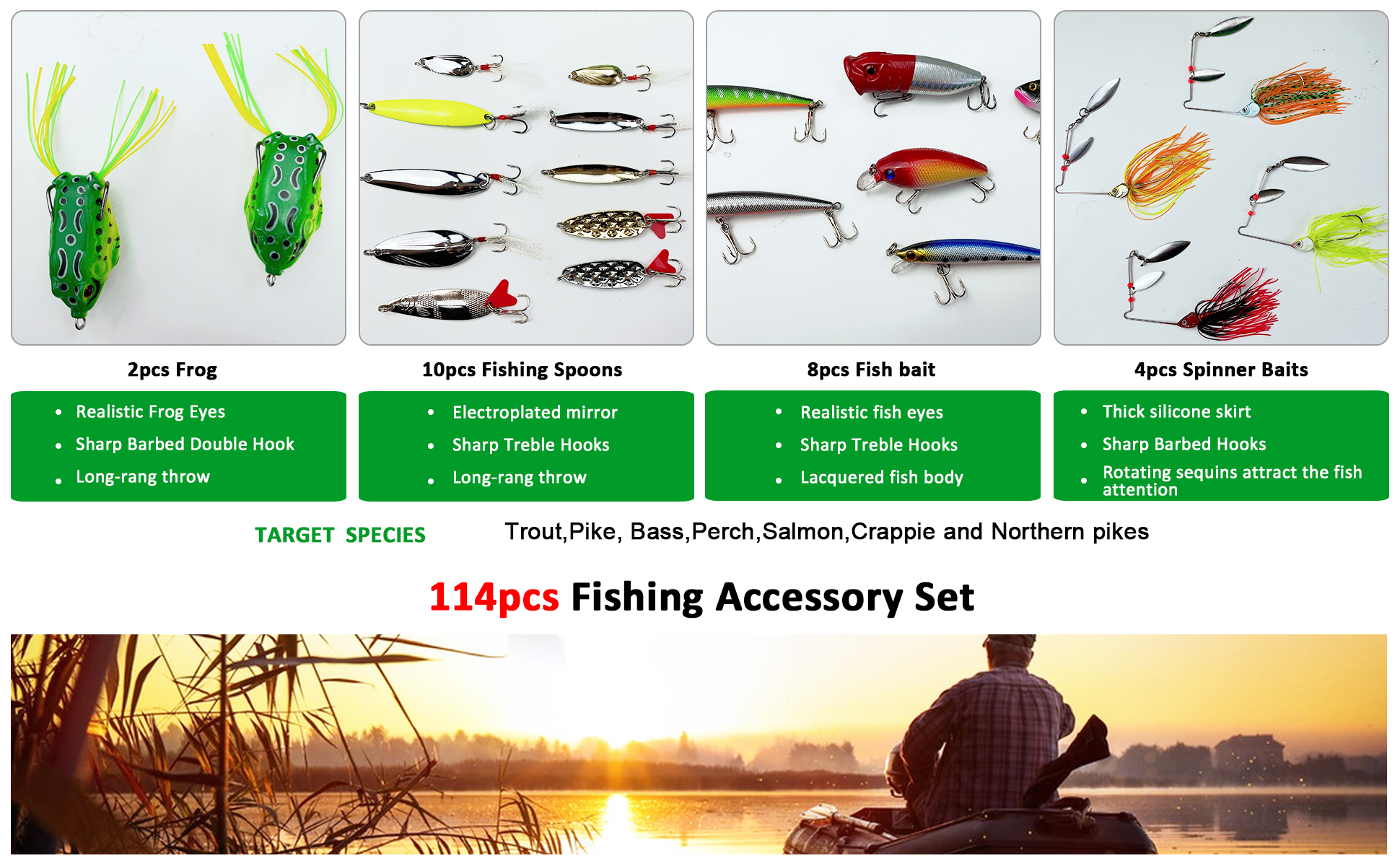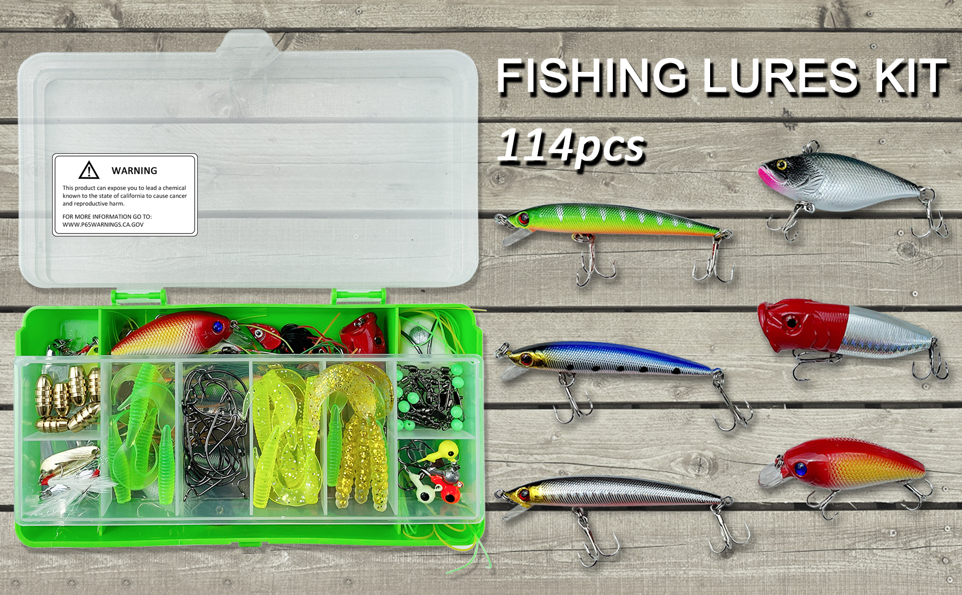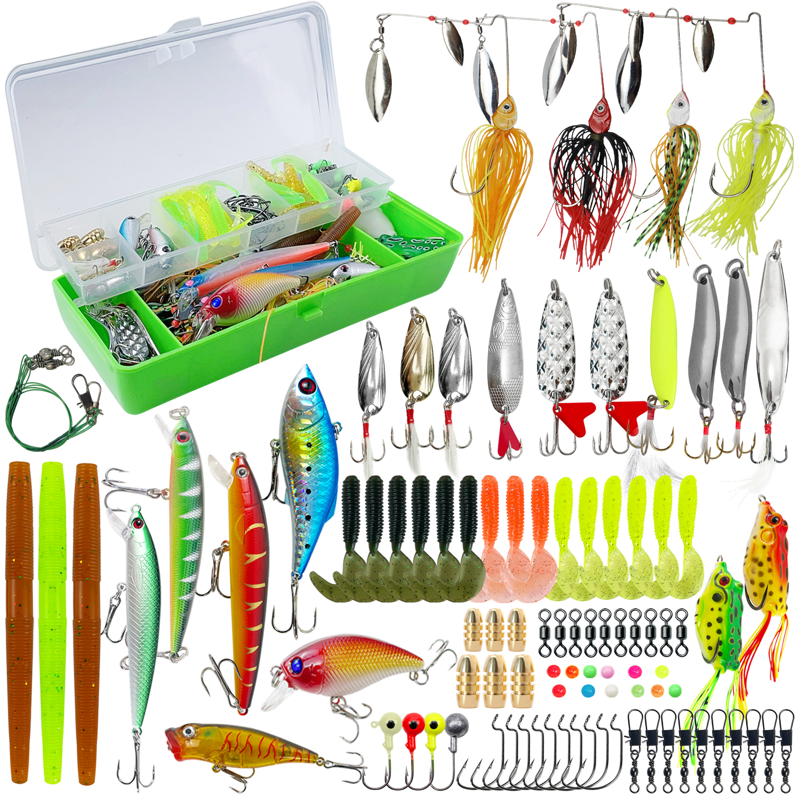 🎣2.Inluding(114pcs):Comes with 4 x spinner baits, 10 x fishing spoons, 2 x frog, 11 x soft lures, fishing rolling barrel swivels, jigs, 7 x minnows, 2 x crankbaits, 1 x popper, and more fishing equipment. A complete range for any angler for any season in fresh and salt water.