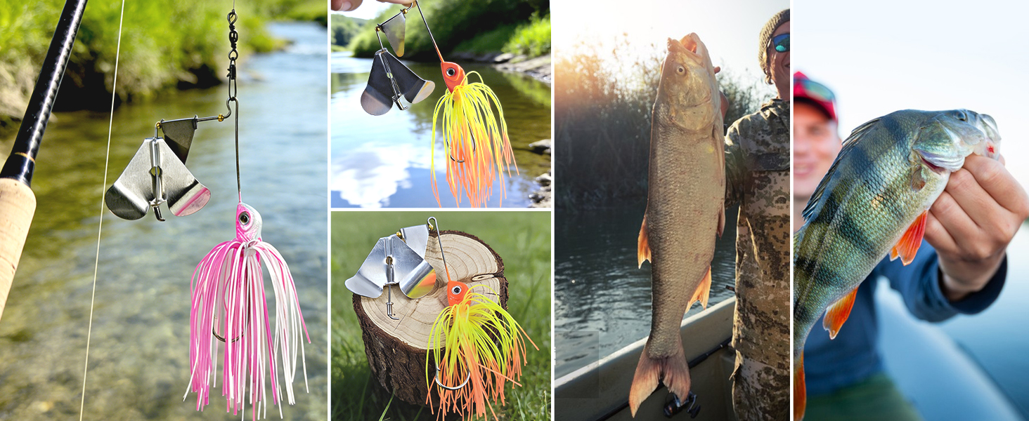 🎣1.Ultimate Performance:Equipped with a double propeller, this buzzbait provides unique water disturbance, creating vibrations that attract fish from a distance. Whether you're fishing in shallow waters or near heavy cover, this tool is perfect for pinpointing where the fish are hiding.