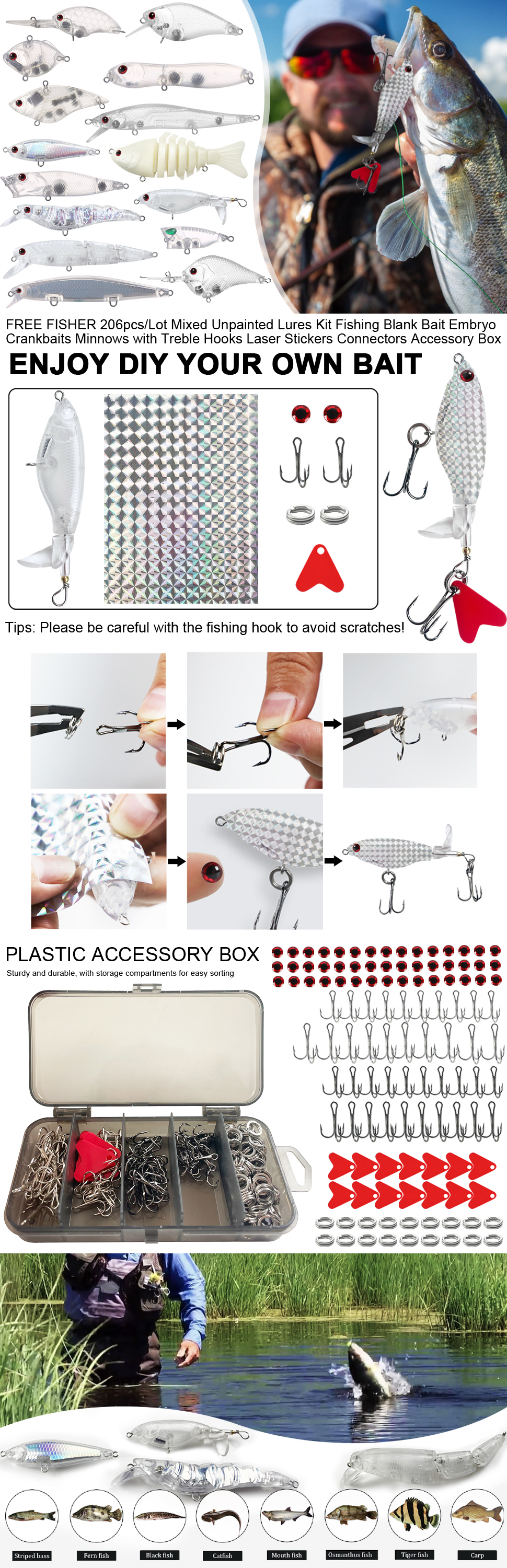 FREE FISHER Mixed Unpainted Lures Kit Fishing Blank Bait Embryo Crankbaits Minnows with Treble Hooks Laser Stickers Connectors Accessory Box