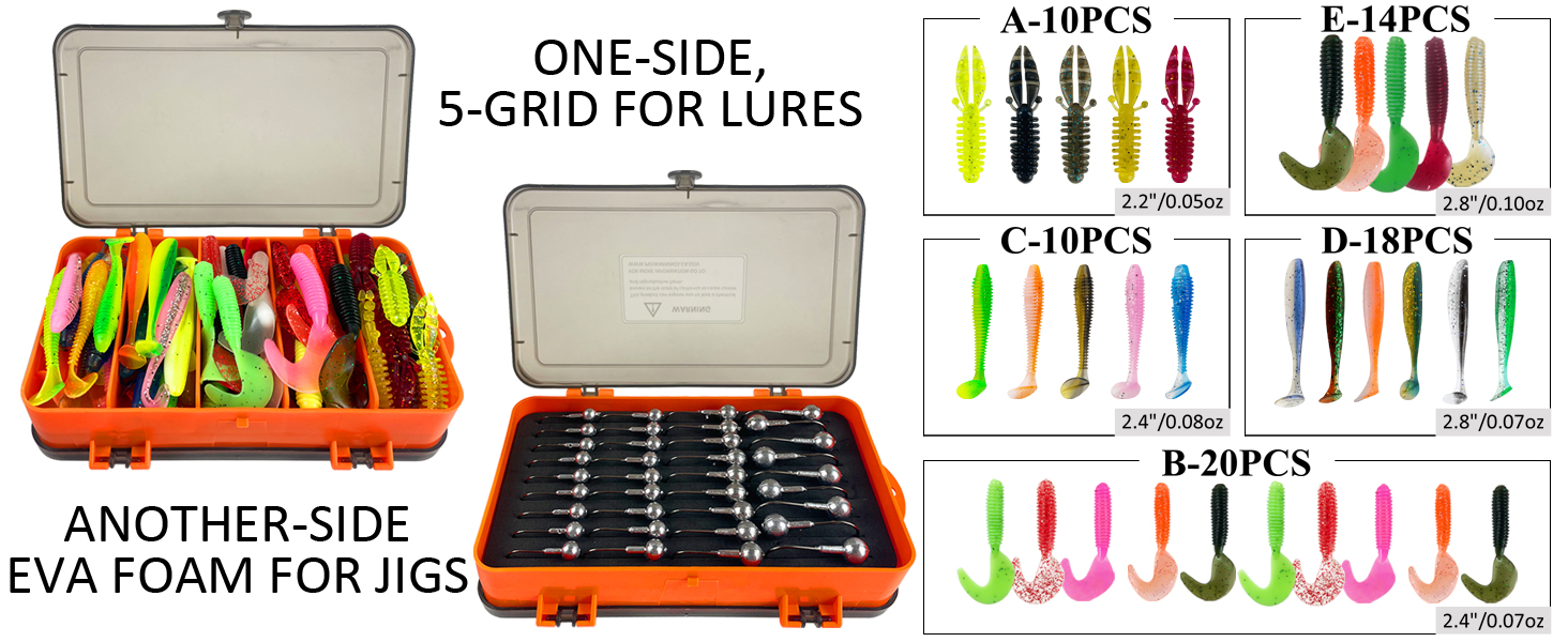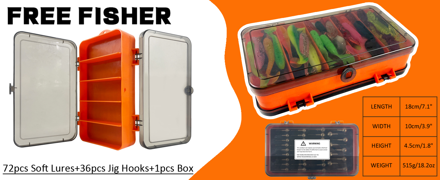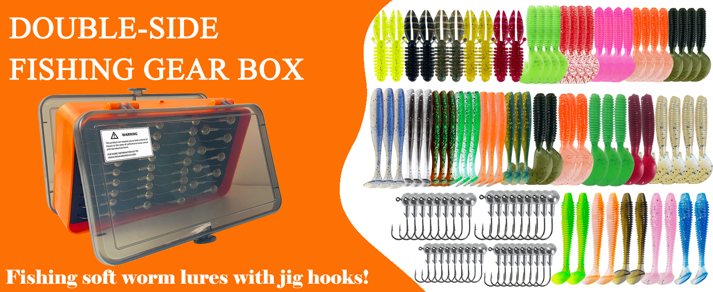 FREE FISHER Soft Worm Grubs Kit with Jig Hooks,109pcs/Lot Fishing Tackle Box,Tail Swimbaits,Bass Fishing Baits Jigging Head Hooks