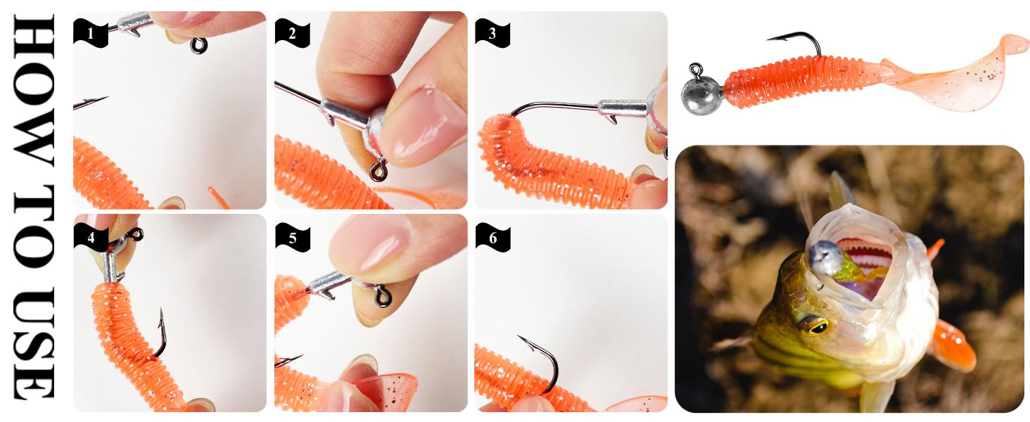 🎣2. Single Tail Worm Baits(34pcs): Threaded Single Tail Soft Bait, after entering the water, the tail of the bait swings vividly and realistically, attracting fish attacks and having a very high rate of catching fish.
