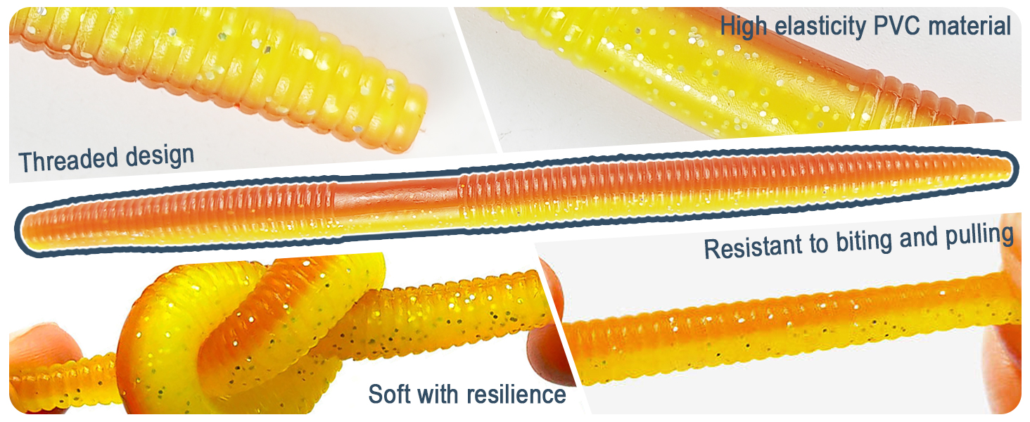 🎣2.Color Flash and Attractant Scent---Variety of colors worm lures infused with color flash gives these rubber bugs a great appeal. Infused with dense salt and fish attractant scent, creating a large scent field. Make fish hold on up to longer.